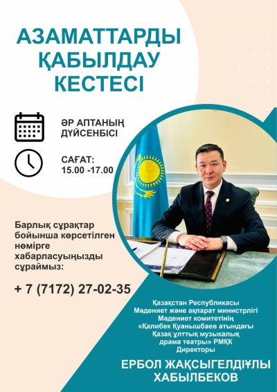 Байланыс Театр кассасы: +7 7172 24 83 23 Қабылдау бөлмесі: +7 7172 27 02 35 PR, маркетинг және жарнама бөлімі: +7 7172 24 87 65 kazteatr@mail.ru Баспасөз қызметі: +7 7172 24 87 65 pressa: kazteatr@mail.ru Бізді әлеуметтік желіден таба аласыз: Instagram Facebook youtube.com tiktok.com