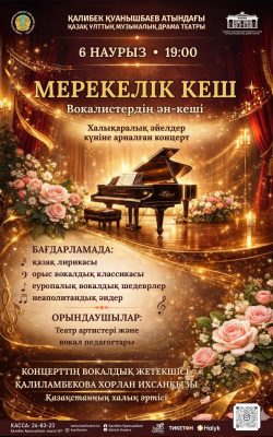 Құрметті көрермен! Қалибек Қуанышбаев атындағы Қазақ ұлттық музыкалық драма театры 8 наурыз Халықаралық әйелдер күніне орай театрымыздың артистері мен вокалистерінің қатысуымен мерекелік кеш өткізеді.