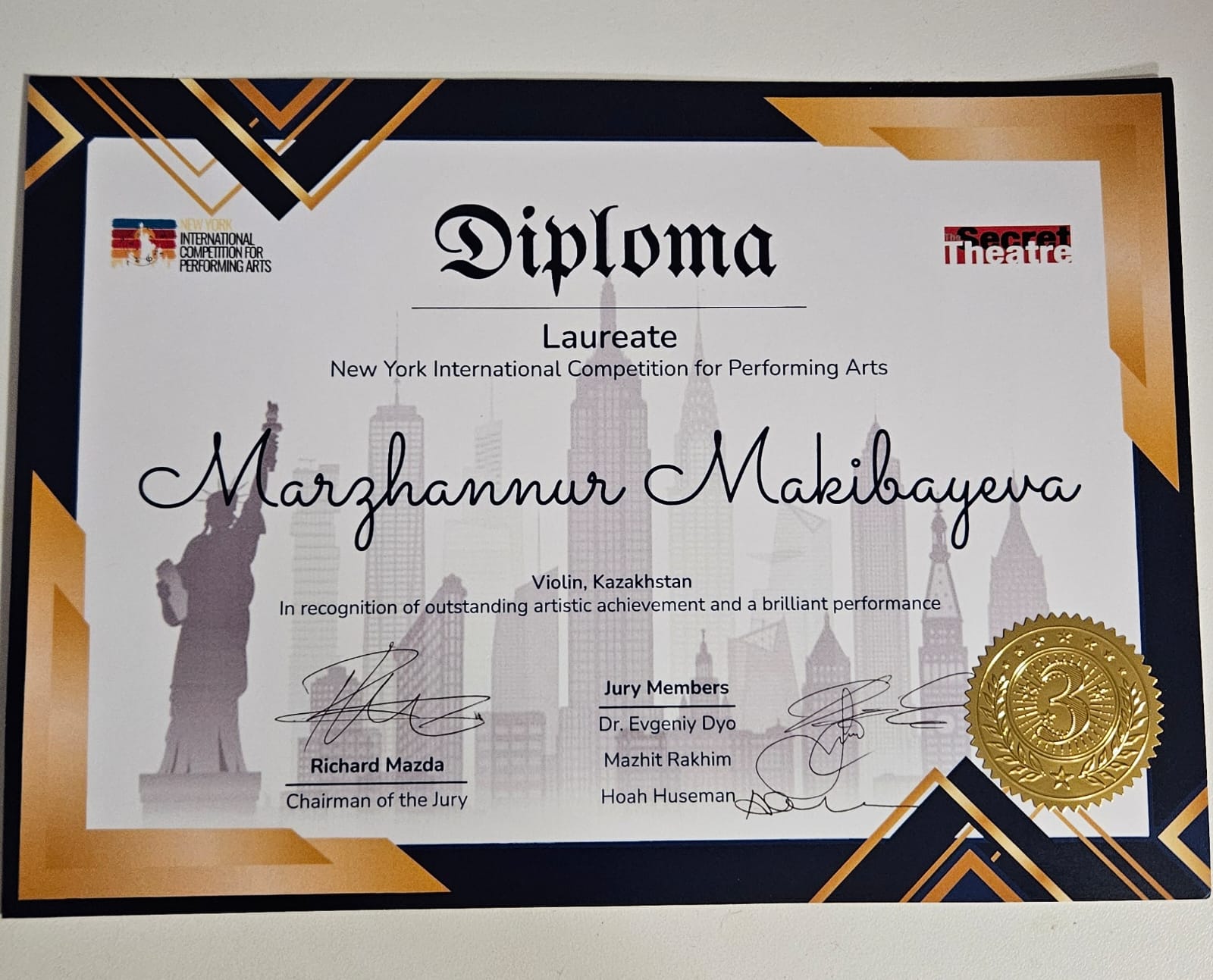 Marzhannur Zhomartkyzy Makibayeva, violinist and artist of our theatre’s “Theatre Avenue” band, has won 3rd prize at an international performing arts competition held in New York.