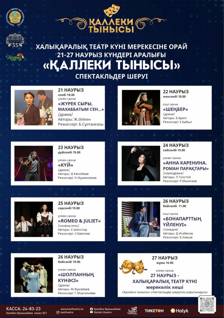 The Kazakh National Musical Drama Theatre named after Kalibek Kuanyshbayev invites you to the traditional “Kalleki Breath” Parade of Performances, dedicated to International Theatre Day, which will take place from March 21 to March 27.