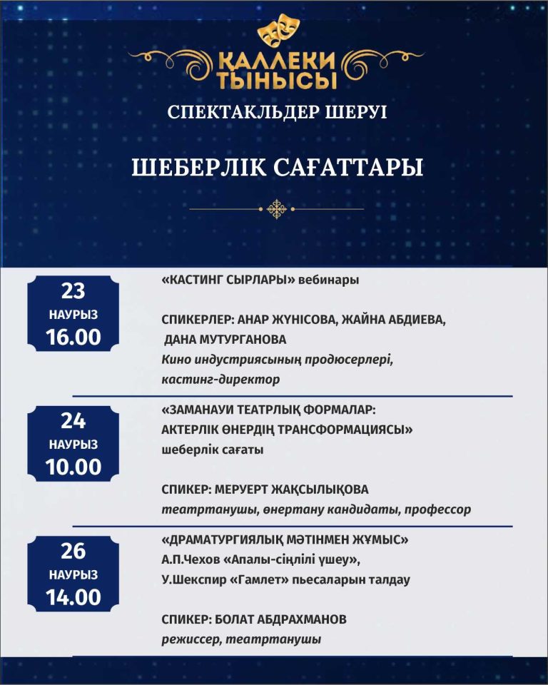 “Қаллеки тынысы” спектакльдер шеруі аясында ұйымдастырылатын шеберлік сағаттарының кестесімен таныса отырыңыздар!