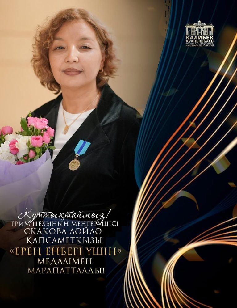 Қазақстан Республикасының ұлттық мерекесі Республика күні қарсаңында Президент Қасым-Жомарт Тоқаевтың Жарлығымен мемлекетіміздің мәдени дамуына қосқан елеулі үлесі үшін театрымыздың «Грим цехының меңгерушісі» Скакова Ләйлә Капсаметовна «Ерең еңбегі үшін» медалімен марапатталды!