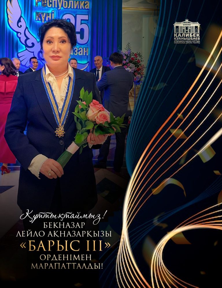 В преддверии национального праздника Республики Казахстан — Дня Республики, Указом Президента Касым-Жомарта Токаева за значительный вклад в культурное развитие страны актриса, Заслуженный деятель Казахстана Лейло Акназаркызы Бекназар награждена орденом «Барыс» III степени!