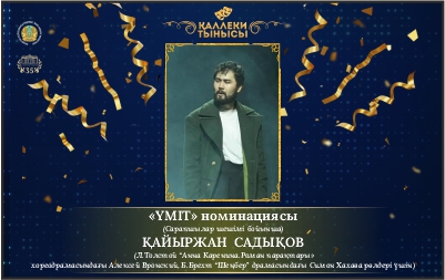 Номинация «Надежда» была присуждена молодому актёру Кайыржану Садыкову за исполнение ролей Алексея Вронского в спектакле «Анна Каренина. Страницы романа», Симона Хахавы в драме Б. Брехта «Круг» и Кокбори в спектакле «Күй» по произведению Ә. Кекілбаева.